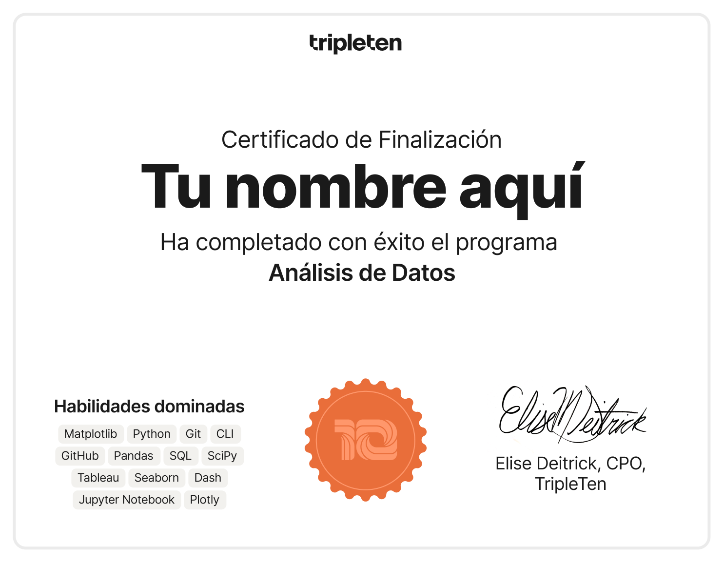 ¡Eso es todo! Nosotros te daremos la plataforma de aprendizaje, las herramientas y el apoyo. Tú pones la motivación, nosotros te ayudamos a construir una carrera en el Análisis de Datos.