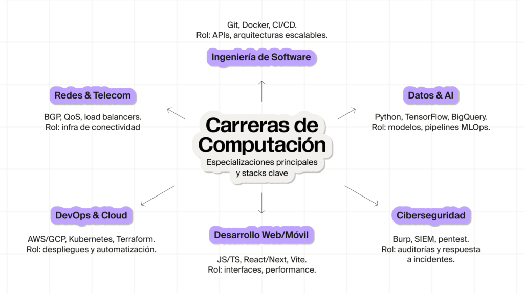 Las carreras de computación agrupan programas formativos orientados al diseño, construcción y operación de sistemas informáticos: desde el desarrollo de aplicaciones, hasta infraestructuras cloud y pipelines de datos. Se imparten como licenciaturas o ingenierías, programas técnicos, bootcamps y carreras de programación online, y todas comparten un núcleo que se compone de lógica, algoritmos, estructuras de datos, programación y buenas prácticas de ingeniería (testing, control de versiones y despliegues automatizados).