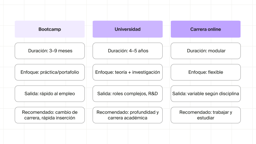 ¿Cómo elegir sabiamente? | * Si necesitas inserción rápida → bootcamp + 3 proyectos sólidos. * Si buscas profundidad teórica o investigación → licenciatura/ingeniería. * Si necesitas la mayor flexibilidad → carrera online o cursos modulares. |