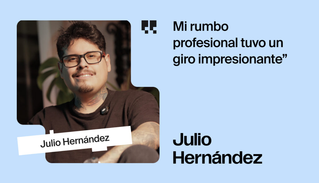 Este conjunto de herramientas —además del apoyo profesional de alto nivel que recibió en el bootcamp— fueron para Julio un punto de inflexión: sabía que ahora estaba listo para regresar a tech, y desempeñar su trabajo con seguridad y confianza.
