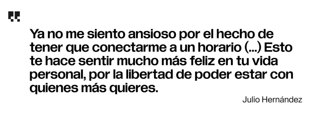 A la fecha, Julio comenta que haber logrado un ascenso tan “fácilmente” fue un hecho que lo maravilló sumamente, dado que ya llevaba un rato buscando una oportunidad en la que todo hiciera match: su experiencia, el tipo de empresa, la flexibilidad de horario (para lograr pasar más tiempo con su familia), y, sobre todo, que incluyera una comunidad en la que pudiera desarrollar sus talentos con naturalidad, a la par de sentirse valorado por su trabajo.