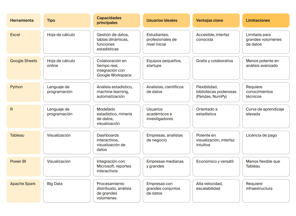 Si ya trabajas con datos, aquí encontrarás una comparación práctica entre herramientas populares como Excel, SQL, Power BI, Python, R y Apache Spark, con ejemplos de aplicación en negocios reales. El objetivo es que puedas identificar cuándo usar cada una, qué limitaciones considerar y cómo combinarlas para obtener informes más claros, procesos más eficientes y mejores decisiones basadas en datos.