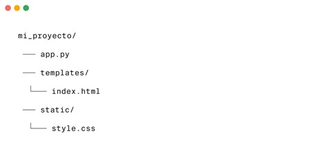 En Python, las aplicaciones web suelen dividirse en módulos (archivos .py) y carpetas que separan la lógica del negocio, la configuración y los recursos estáticos (CSS, imágenes, JavaScript). Este es el ejemplo de una estructura mínima en Flask: