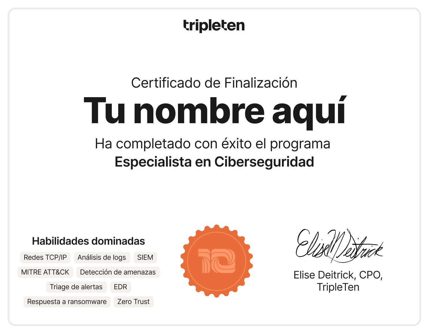 ¡Eso es todo! Nosotros te daremos la plataforma de aprendizaje, las herramientas y el apoyo. Tú pones la motivación, nosotros te ayudamos a construir una carrera en Ciberseguridad. Con solo estas herramientas básicas, puedes empezar a estudiar para convertirte en Especialista en Ciberseguridad.